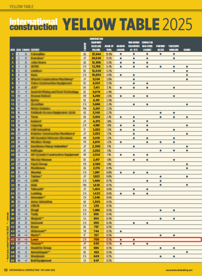 近日,全球工程機械行業(yè)權(quán)威資訊機構(gòu)KHL旗下的《International Construction》雜志發(fā)布了備受矚目的《Yellow Table 2025》榜單。中國工程機械企業(yè)雷沃重工在此次榜單中表現(xiàn)卓越,以7.06億美元的銷售額躍居全球第45位,較2024年大幅提升了4個名次,進一步彰顯了其在工程機械行業(yè)的硬核實力。