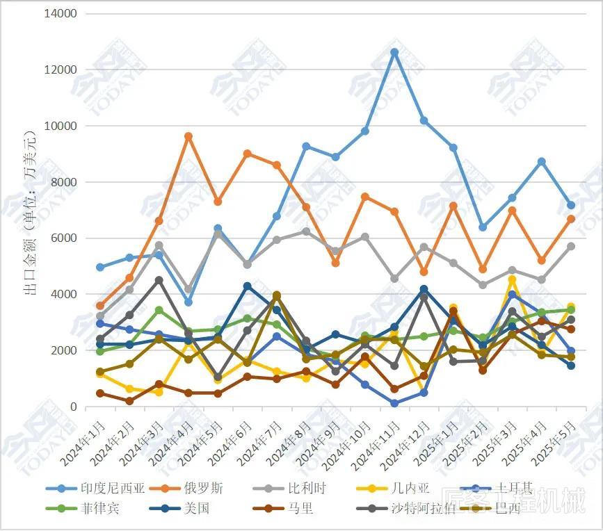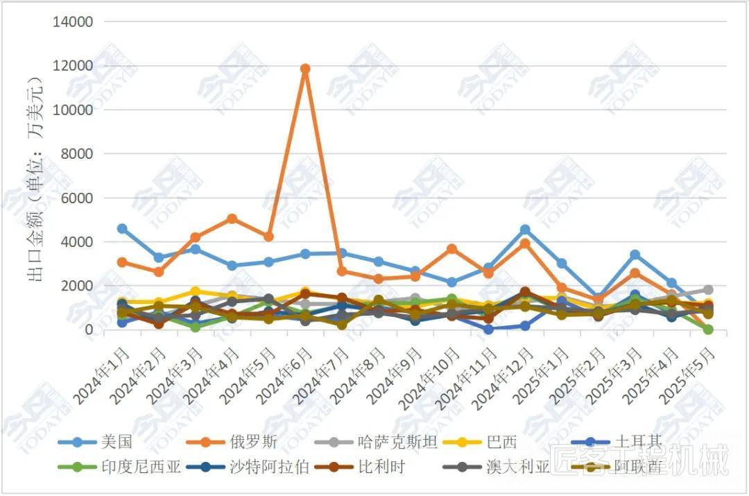 從2025年1—5月主要工程機械產品進出口貿易情況來看,對俄羅斯、美國、印度尼西亞出口金額排名位列前三,其次為沙特阿拉伯、巴西、印度、巴西、阿聯(lián)酋、澳大利亞、日本、越南。相較2025年1—4月的排名,印度上升進入前五,巴西下降至第六。