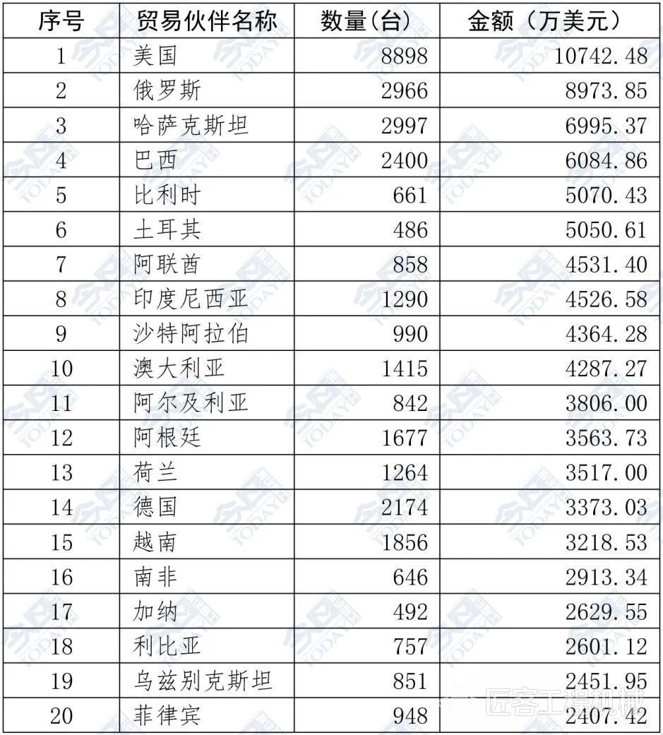 對美國、俄羅斯和哈薩克斯坦出口位列前三。其次依次為巴西、比利時、土耳其、阿聯(lián)酋、印度尼西亞、沙特阿拉伯、澳大利亞位列前十。2025年5月裝載機出口額排名前二十位國家和地區(qū)具體情況如表3所示。