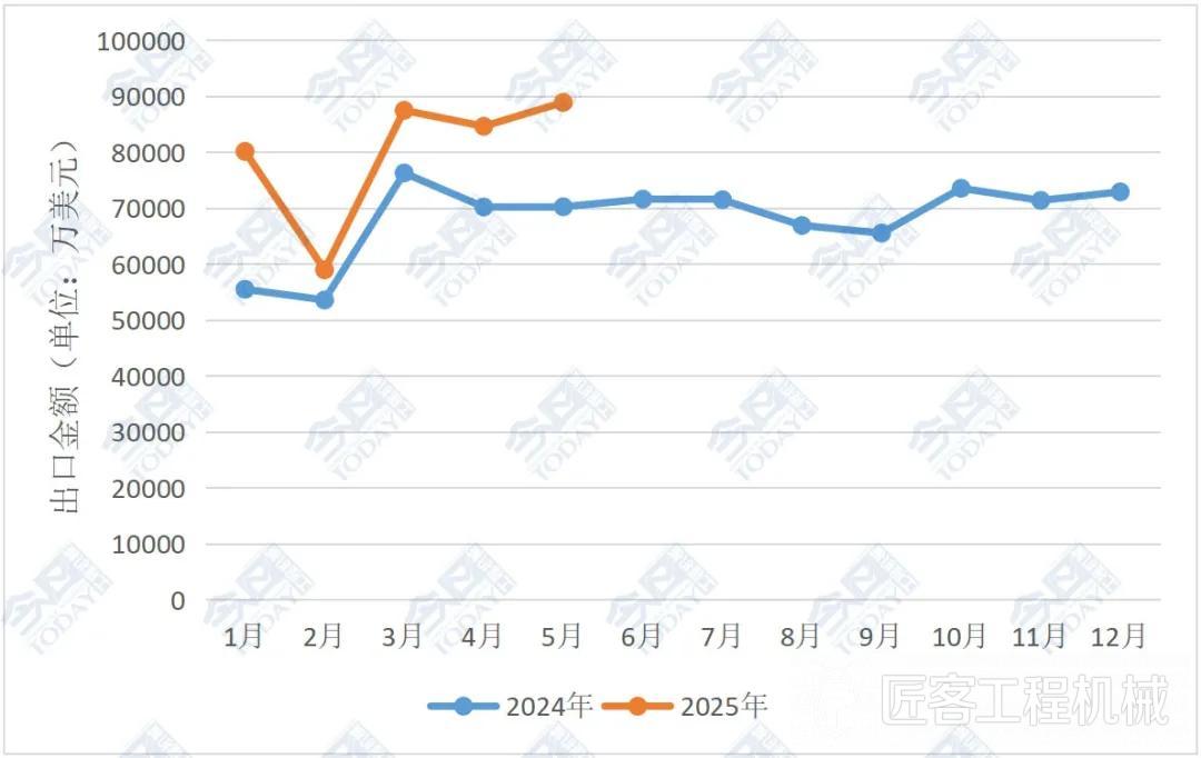 環(huán)比來看,2025年5月我國挖掘機(含履帶挖掘機和輪式挖掘機)出口總額為8.89億美元,較2025年4月的8.46億美元上升5.05%。