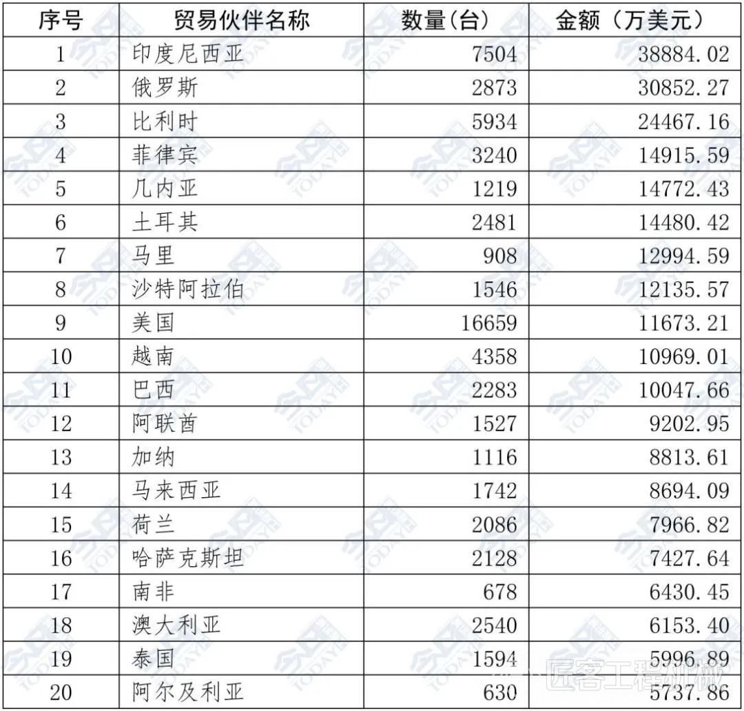 表2 2025年1—5月挖掘機出口額排名前二十位國家和地區(qū)