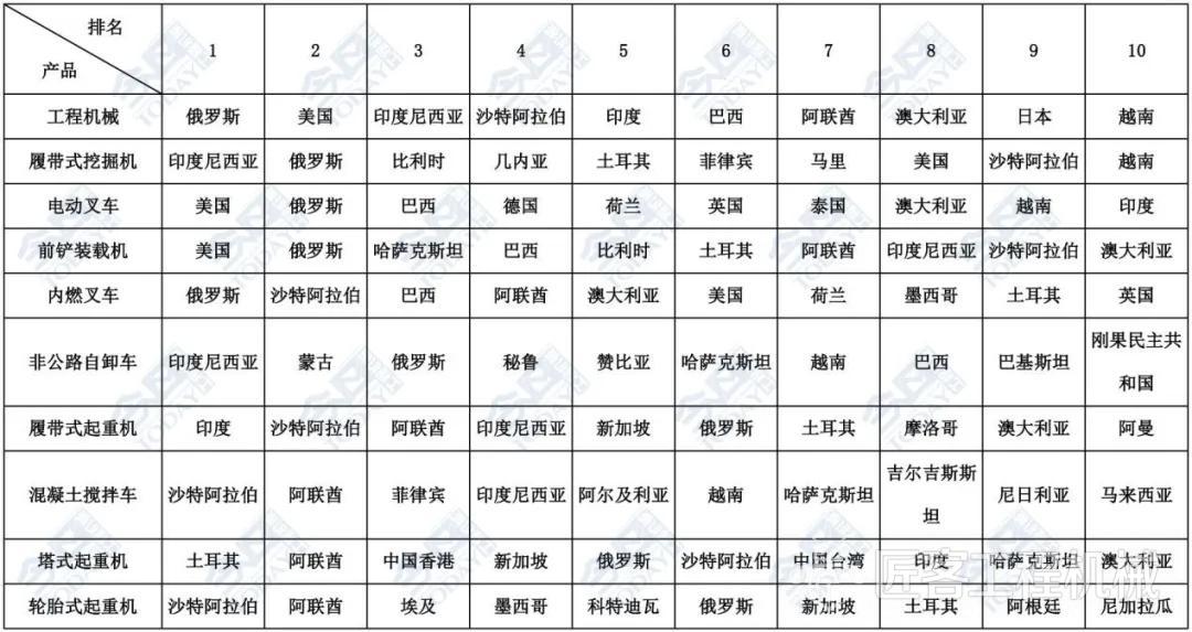 表1 2025年1-5月主要工程機械產品出口金額排名前十位國家和地區(qū)