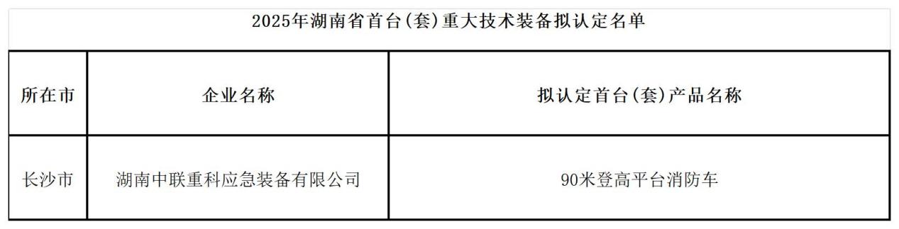中聯(lián)重科90米登高平臺消防車入選《2025湖南省首臺(套)重大技術(shù)裝備擬認(rèn)定名單》