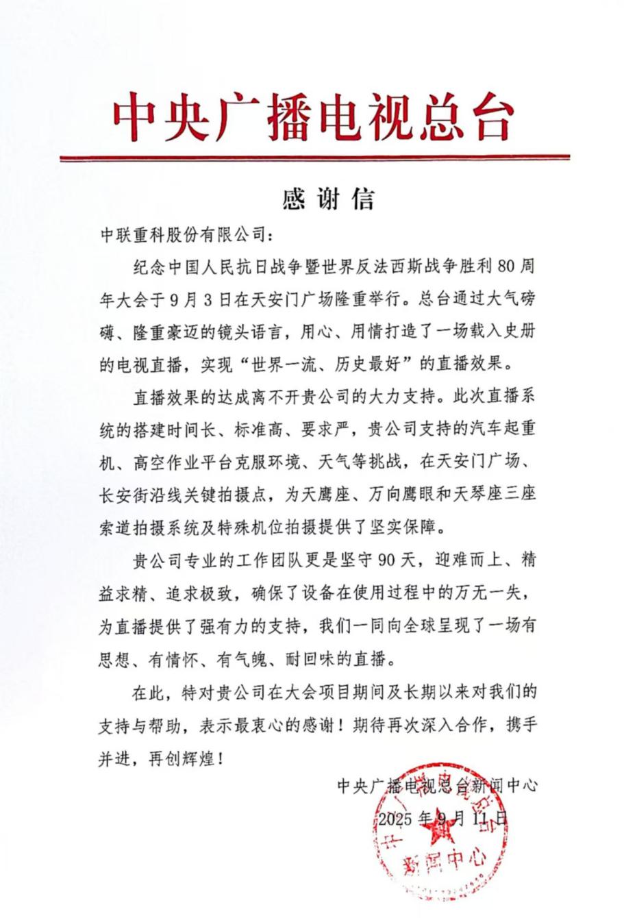 在紀(jì)念中國人民抗日戰(zhàn)爭暨世界反法西斯戰(zhàn)爭勝利80周年大會直播報道中,總臺通過大氣磅礴、隆重豪邁的鏡頭語言,用心、用情打造了一場載入史冊的電視直播,實(shí)現(xiàn)“世界一流、歷史最好”的直播效果。“直播效果的達(dá)成離不開貴單位的大力支持”,總臺在信中充分肯定中聯(lián)重科的貢獻(xiàn)。根據(jù)信中介紹,此次直播系統(tǒng)的搭建時間長、標(biāo)準(zhǔn)高、要求嚴(yán),中聯(lián)重科支持的汽車起重機(jī)、高空作業(yè)平臺克服環(huán)境、天氣等挑戰(zhàn),在天安門廣場、長安街沿線關(guān)鍵拍攝點(diǎn),為天鷹座、萬向鷹眼和天琴座三座索道拍攝系統(tǒng)及特殊機(jī)位拍攝提供了堅實(shí)保障。中聯(lián)重科項目工作團(tuán)隊更是堅守90天,迎難而上、精益求精、追求極致,確保了設(shè)備在使用過程中的萬無一失。
