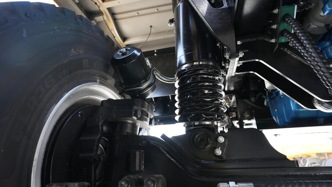前懸架采用五連桿-非獨(dú)立式油氣懸架,懸架支點(diǎn)均采用鑄鋼件整體成型,可靠性高;油缸支點(diǎn)內(nèi)傾角梯形布置,穩(wěn)定性更好。