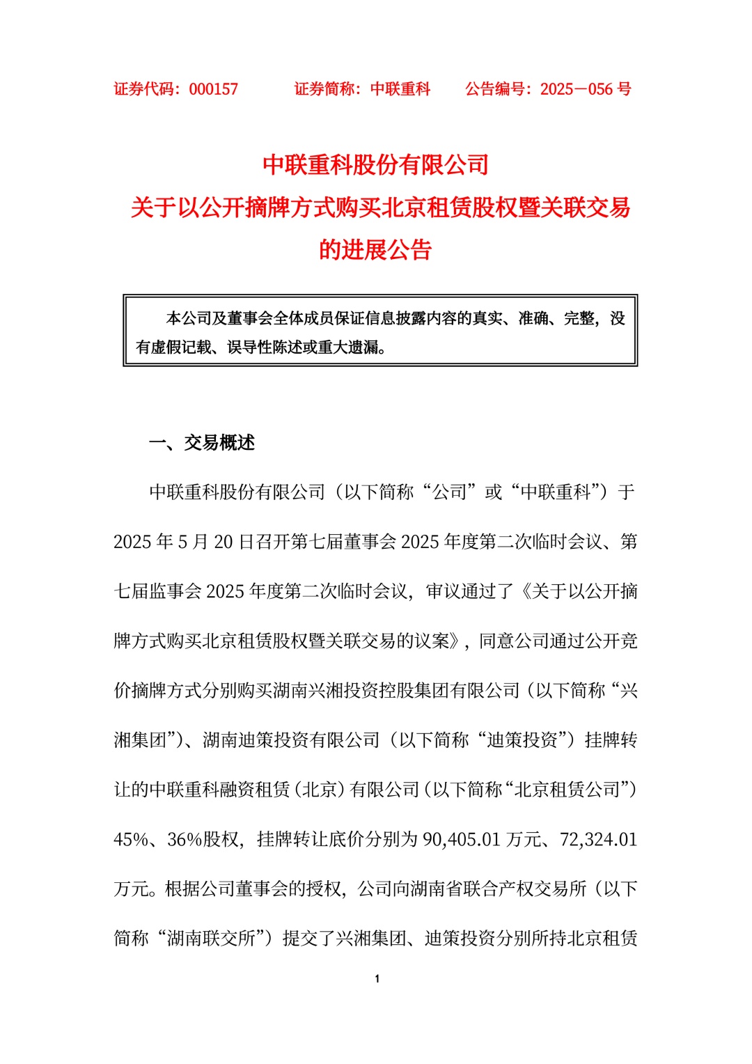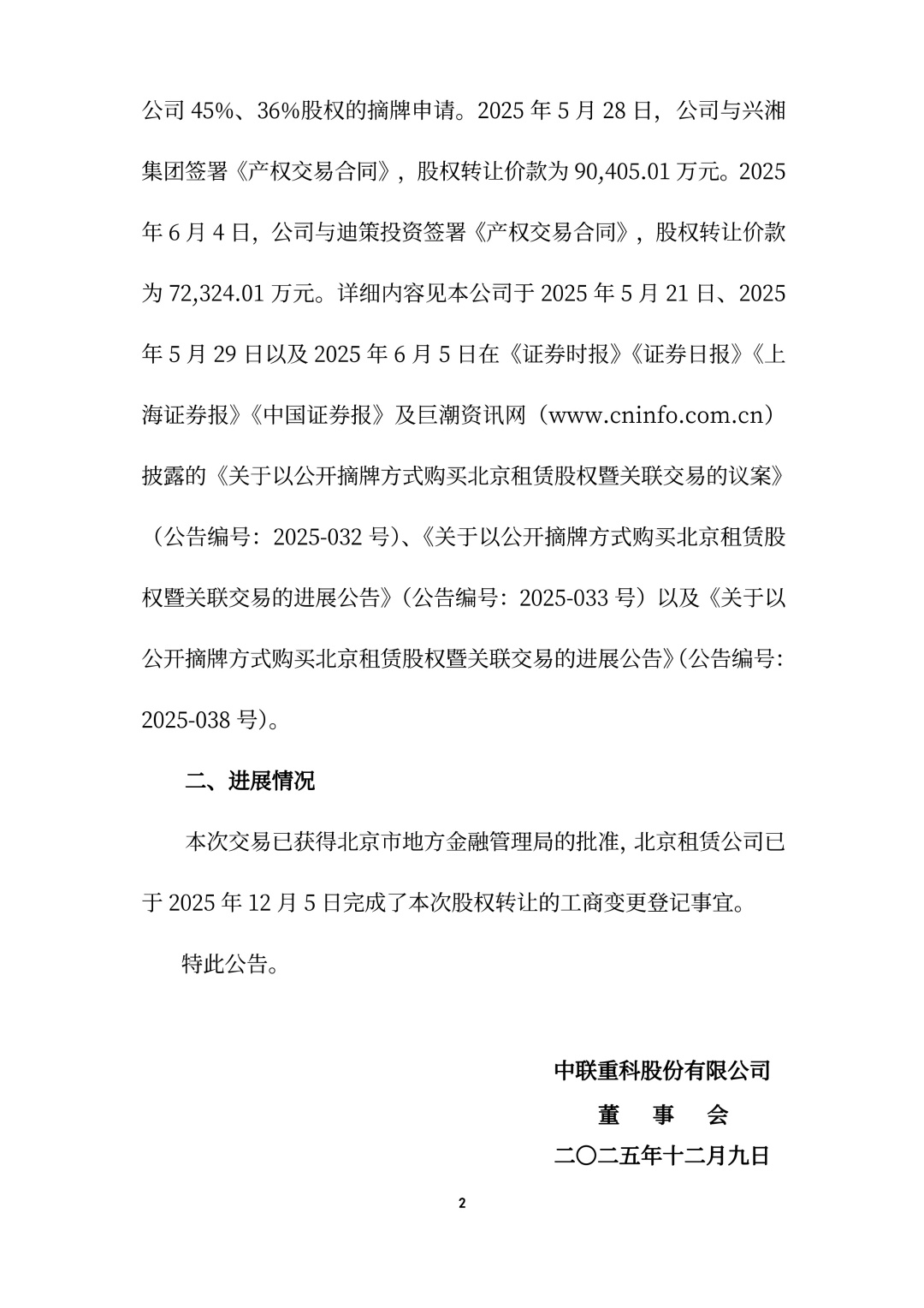 中聯(lián)重科股份有限公司(以下簡稱“公司”或“中聯(lián)重科”)于2025 年 5 月 20 日召開第七屆董事會(huì) 2025 年度第二次臨時(shí)會(huì)議、第七屆監(jiān)事會(huì) 2025 年度第二次臨時(shí)會(huì)議,審議通過了《關(guān)于以公開摘牌方式購買北京租賃股權(quán)暨關(guān)聯(lián)交易的議案》,同意公司通過公開競價(jià)摘牌方式分別購買湖南興湘投資控股集團(tuán)有限公司(以下簡稱“興湘集團(tuán)”)、湖南迪策投資有限公司(以下簡稱“迪策投資”)掛牌轉(zhuǎn)讓的中聯(lián)重科融資租賃(北京)有限公司(以下簡稱“北京租賃公司”)45%、36%股權(quán),掛牌轉(zhuǎn)讓底價(jià)分別為 90405.01 萬元、72324.01萬元。根據(jù)公司董事會(huì)的授權(quán),公司向湖南省聯(lián)合產(chǎn)權(quán)交易所(以下簡稱“湖南聯(lián)交所”)提交了興湘集團(tuán)、迪策投資分別所持北京租賃公司 45%、36%股權(quán)的摘牌申請。2025 年 5 月 28 日,公司與興湘集團(tuán)簽署《產(chǎn)權(quán)交易合同》,股權(quán)轉(zhuǎn)讓價(jià)款為 90405.01 萬元。2025年 6 月 4 日,公司與迪策投資簽署《產(chǎn)權(quán)交易合同》,股權(quán)轉(zhuǎn)讓價(jià)款為 72324.01 萬元。