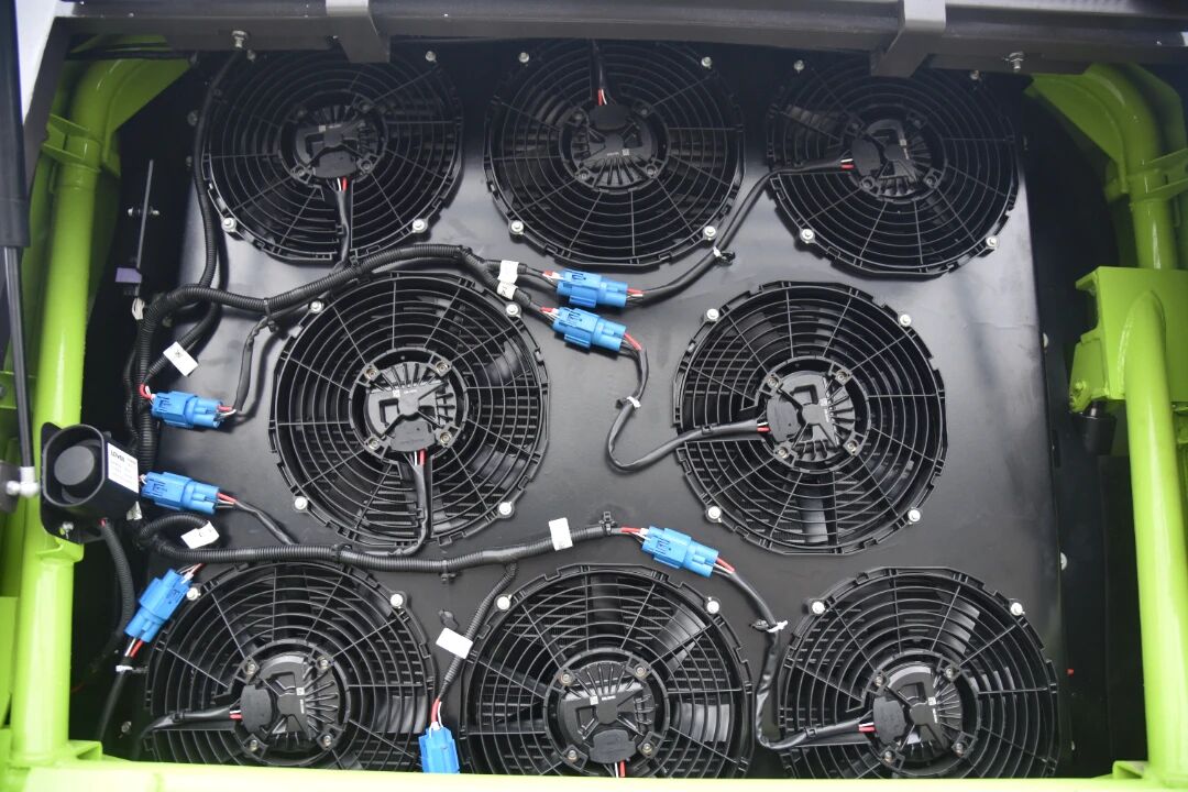 電機(jī)電控散熱系統(tǒng):全并聯(lián)芯體分布,迎風(fēng)面積更大,雙水路循環(huán),散熱效率高,滿足高溫高負(fù)荷作業(yè)需求;8個無刷電子風(fēng)扇,分組控制,熱管單元獨(dú)立ATS智能控制,節(jié)能降噪。