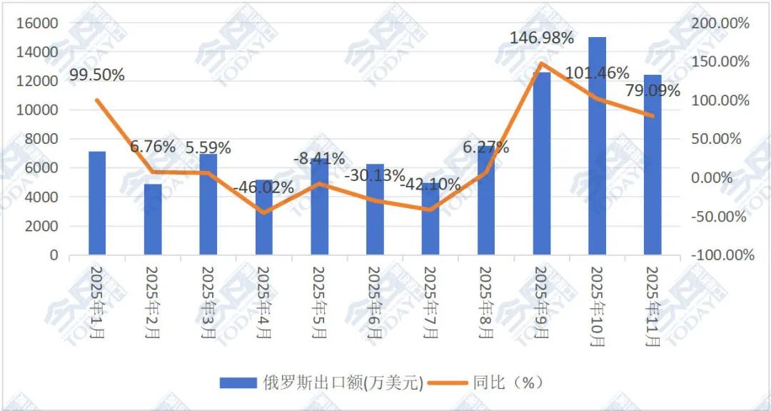 2025年8月起,中國挖掘機對俄羅斯月度出口額連續(xù)突破高位。8月出口額為7534.51萬美元,環(huán)比上升51.48%。隨后,9月出口額猛增至12593.35萬美元,創(chuàng)下2025年月度出口最高紀錄,環(huán)比上升67.14%,同比增幅達146.98%。10月,對俄挖掘機出口額再創(chuàng)新高,達到15034.63萬美元,這不僅是近年來對俄出口峰值,更創(chuàng)下了近兩年中國挖掘機單月對全球單國別出口額的最高紀錄,環(huán)比增長19.39%,同比增幅高達101.46%。盡管11月出口額環(huán)比回落17.46%至12409.26萬美元,但同比仍大幅增長79.09%,仍維持高位。自2025年9月起,俄羅斯已連續(xù)三個月超越印度尼西亞,成為中國第一大挖掘機出口目的國。2024年1月-2025年11月我國挖掘機對俄羅斯月度出口額情況見圖1。2025年1-11月我國挖掘機對俄羅斯月度出口額及同比情況見圖2。