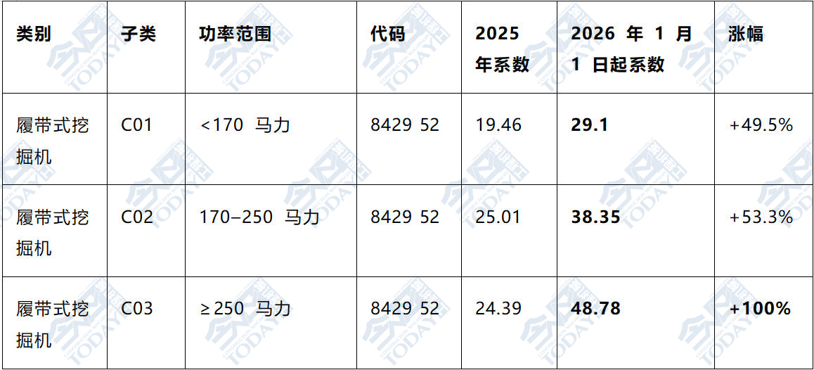 以占出口主力的履帶式挖掘機為例,其稅額計算方式為“系數×基礎稅率(172,500盧布)”。2026年新系數較2025年出現巨幅增長。履帶式挖掘機(C01–C03)稅率變化見表1。