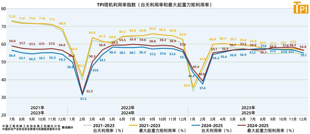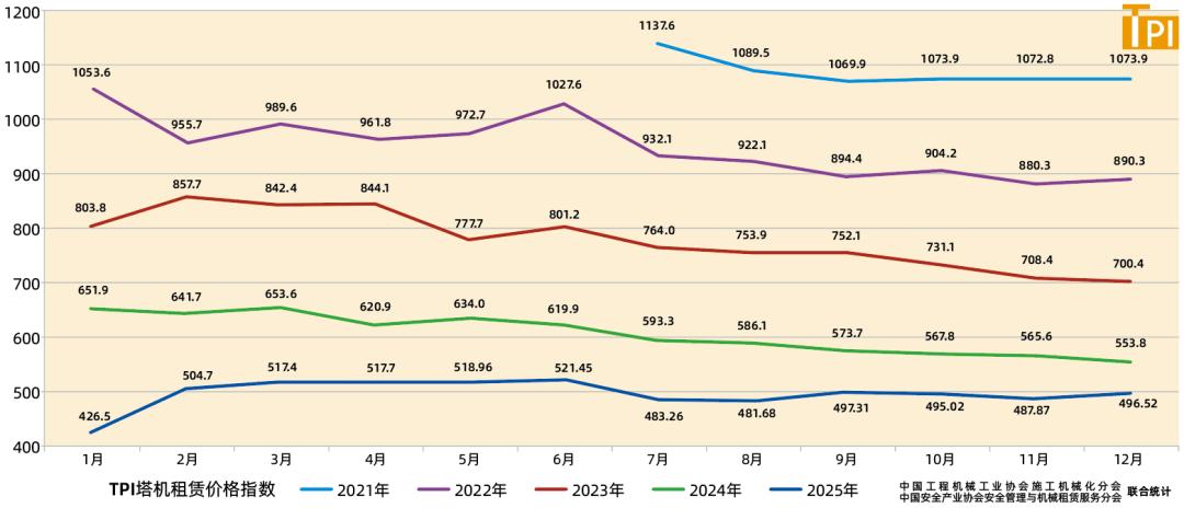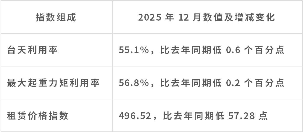 據(jù)中國工程機械工業(yè)協(xié)會施工機械化分會等統(tǒng)計的塔機租賃行業(yè)景氣指數(shù)(TPI),2025年12月份塔機臺天利用率55.1%,最大起重力矩利用率56.8%,分別較上月低2個百分點和1.5個百分點;12月份租賃價格指數(shù)為496.52點,較上月低5.65點,低于去年同期57.283點。